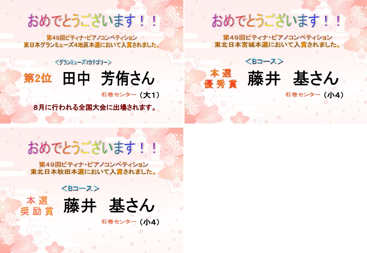 先日行われました、第49回ピティナ・ピアノコンペティション 東日本グランミューズ4地区本選・東北日本秋田本選において入賞された生徒さんをご紹介します♪